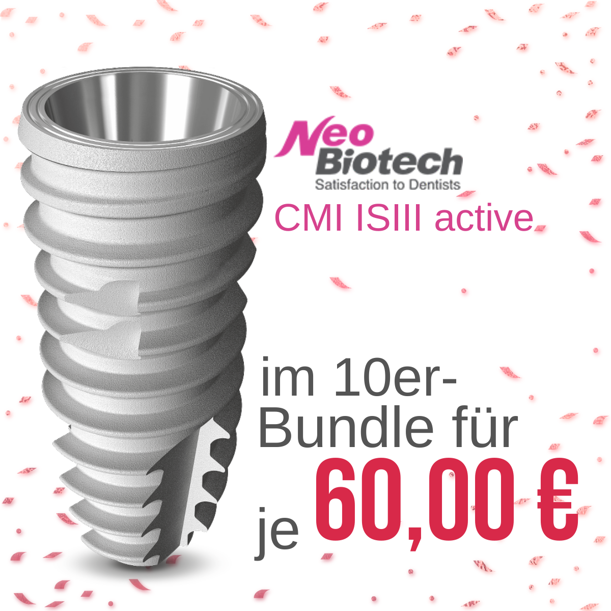 Beim Kauf von 10 NeoBiotech IS3 SLA Active Implantaten reduziert sich der Stückpreis auf 60,00€ pro Implantat. Einfach 10 Implantate in den Warenkorb legen und sparen!